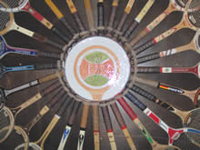 Occorrono altri 2 mesi per realizzare una ulteriore struttura circolare in legno. Intorno ad una preziosa ceramica raffigurante il logo del Museo Cellini, si sviluppa una teoria di stupende racchette d'epoca, impreziosita da fini artigianali ganci in cuoio.